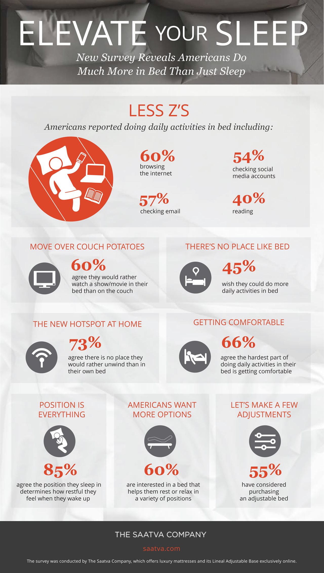 News Elevate your sleep (Infographic) Share this: Share on Facebook (Opens in new window) Facebook Share on Bluesky (Opens in new window) Bluesky Share on X (Opens in new window) X Print (Opens in new window) Print Email a link to a friend (Opens in new window) Email By Contributed ContentPUBLISHED: June 21, 2017 at 6:20 PM CDT | UPDATED: June 3, 2018 at 6:37 PM CDTGetting your Trinity Audio player ready... New survey reveals Americans do much more in bed than just sleep. Save Save Share this: Share on Facebook (Opens in new window) Facebook Share on Bluesky (Opens in new window) Bluesky Share on X (Opens in new window) X Print (Opens in new window) Print Email a link to a friend (Opens in new window) Email