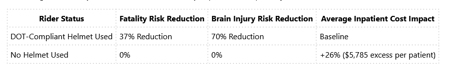 The decision to ride without a helmet heavily influences medical outcomes and legal liability following a collision. Insurance adjusters routinely assess personal negligence when processing medical and financial claims for unhelmeted riders involved in accidents. Recent data from Nebraska demonstrates the severe consequences of altering helmet mandates; motorcycle deaths in the state jumped from 22 in 2023 to 32 in 2024, the year following their helmet law repeal. Riding without head protection also places a documented financial burden on the public health care system. Some sources estimate that repealing helmet laws could increase inpatient costs for crash-related injuries by 26%. This translates to an average of $5,785 in excess medical spending per patient. Medical data from the Centers for Disease Control & Prevention proves that helmets reduce the risk of death by 37% and lower the risk of brain injury by 69%, debunking common myths that helmets cause sensory impairment or spinal injuries.